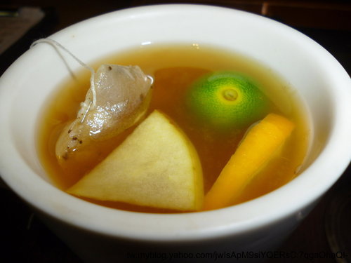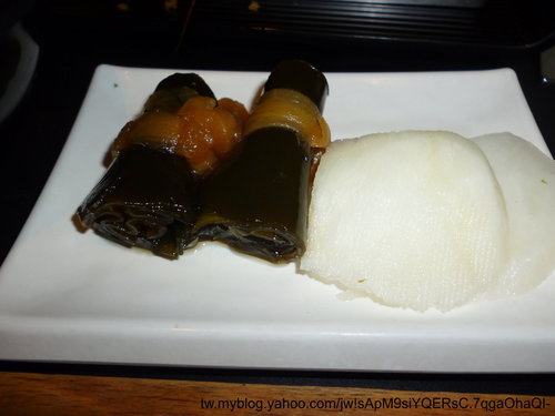 這次的前菜是醃漬的海帶卷跟大頭菜,