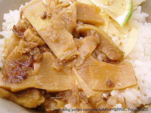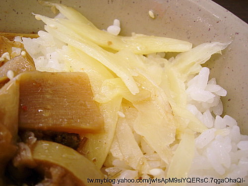 在白飯上放上主菜及筍干與醃薑片,