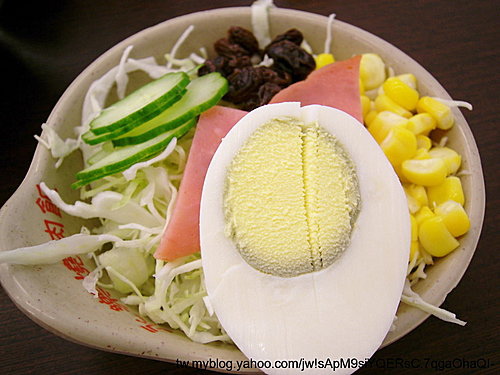 除了必備的高麗菜絲還有玉米、火腿、水煮蛋,
